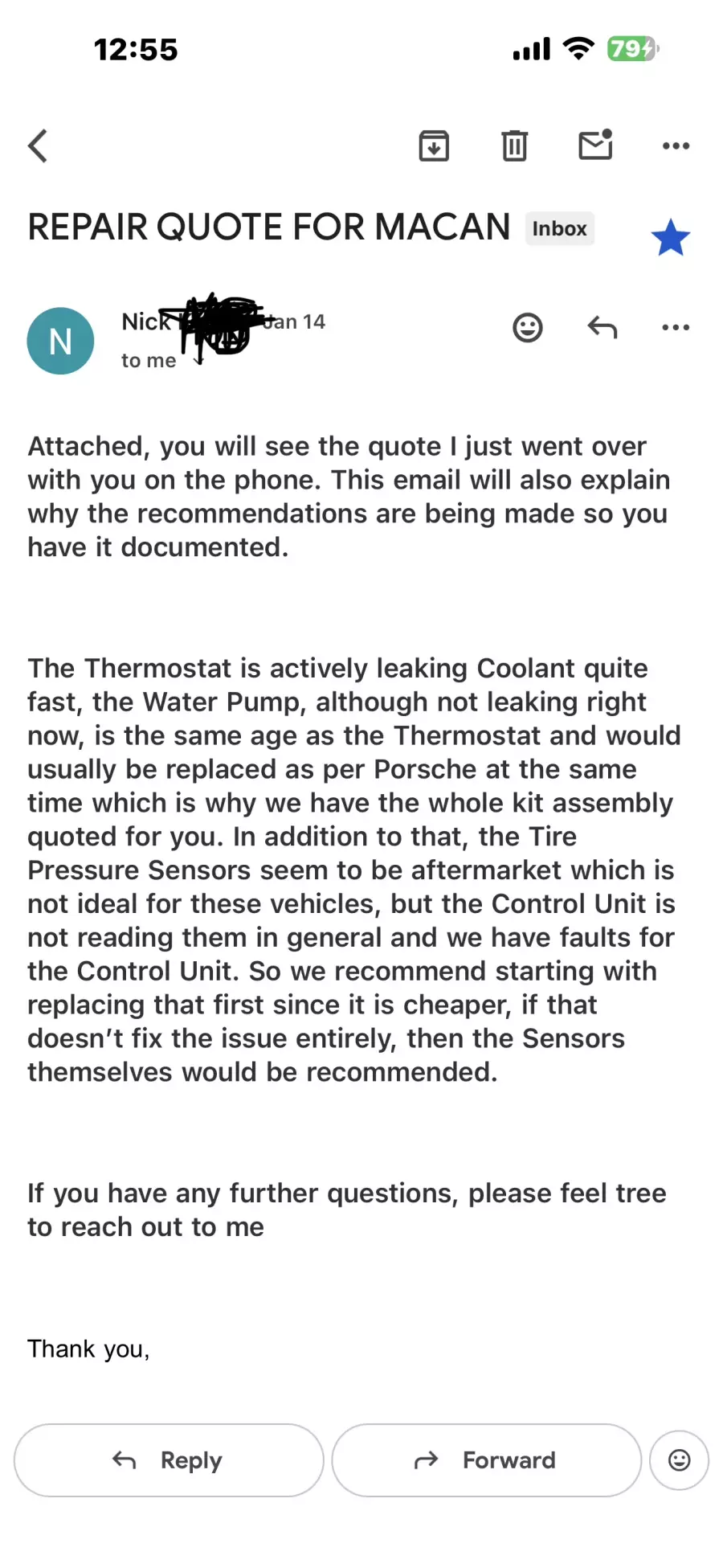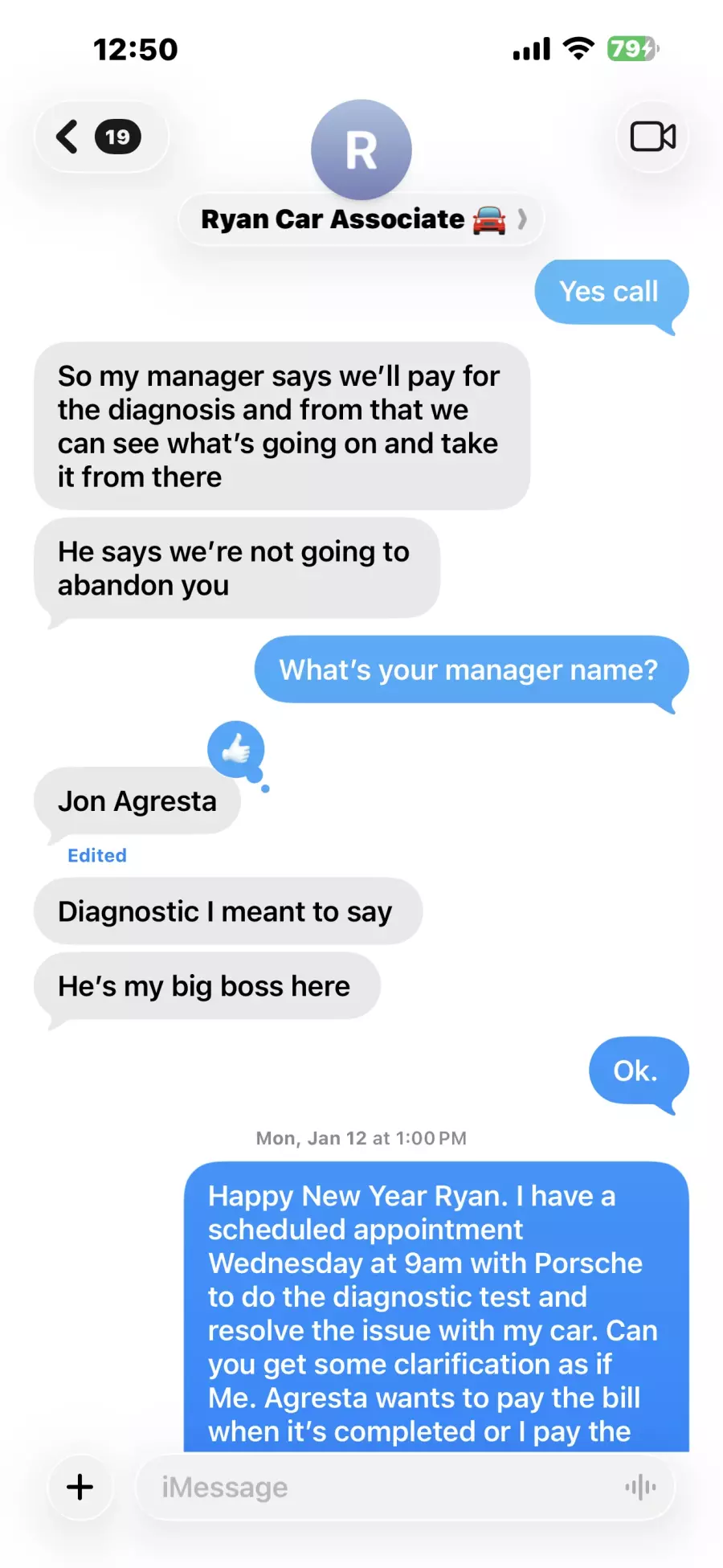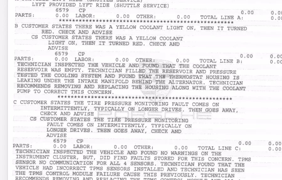 The problems persisted shortly before Christmas, and I eventually took the vehicle to Delaware Porsche, where it was discovered that the tire sensors needed replacement and there was a coolant leak. Although the warranty covers the coolant and thermostat issue, I was left to cover the sensor replacement costs. Ryan initially agreed that his manager, Jon Agresta, would reimburse me for these expenses, but now the dealership is reneging on this commitment.